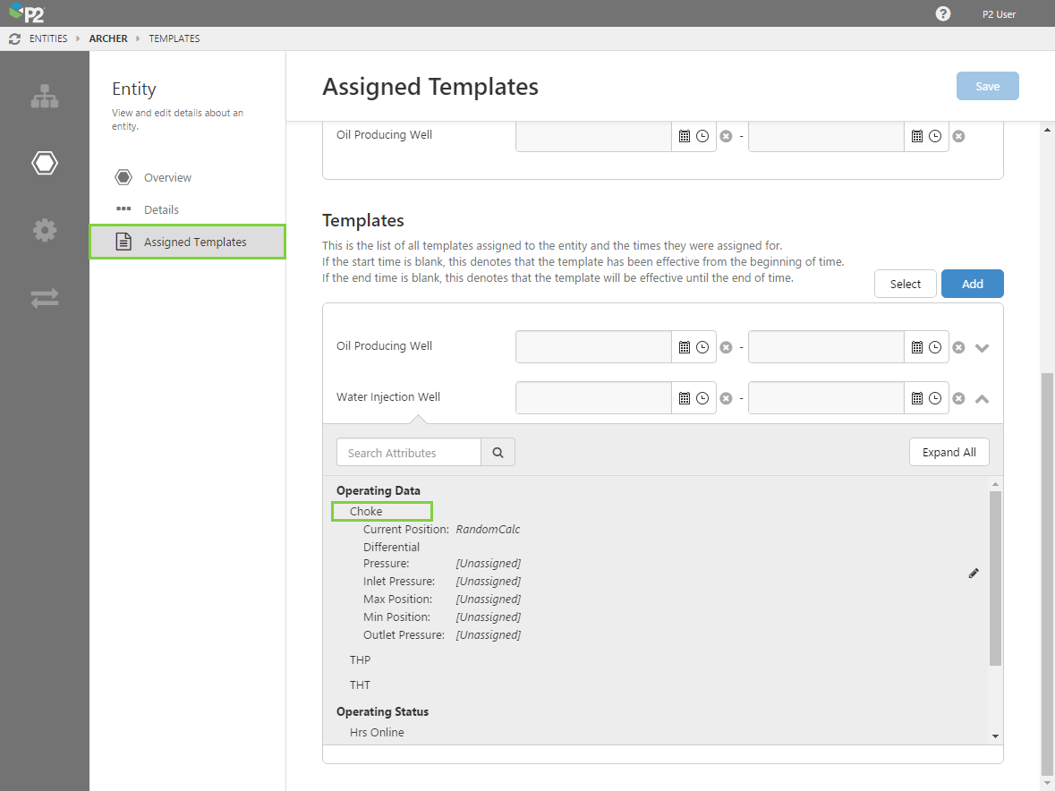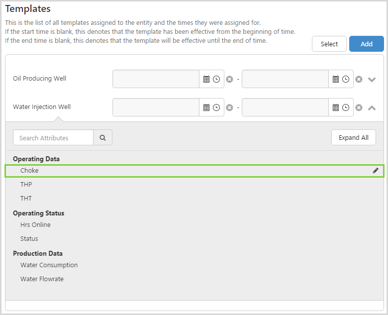 This is where you configure where the attributes will retrieve their values from for this entity. So while a Water Injection Well may already have an attribute for Choke, the entity still needs to pull that attribute value from somewhere. This is where you configure that.