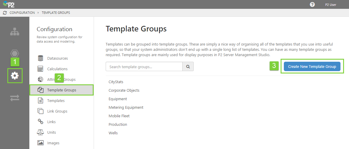 Template groups are a way of organising all the templates you use into useful groups, so that your system administrators don’t end up with a single long list of 50 templates to maintain. Template groups are mainly used for display purposes in IFS OI Server Management, and you can have as many as required. For example, you might have templates that describe measuring equipment, wells, vehicle fleet, corporate areas, and so on.