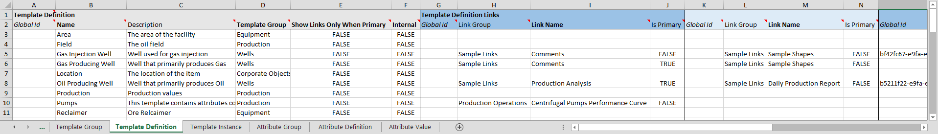 The Template Definition tab is directly dependent on 3 other tabs; Template Group, Link Group, and Link; because columns on the Template Definition tab directly reference columns on those tabs.