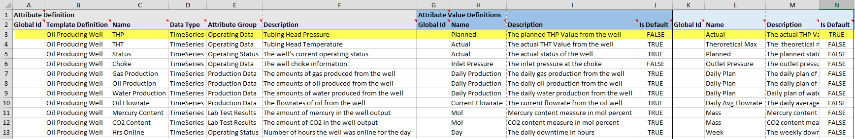 Now, let's focus on the THP attribute on row 3, and scan across to look at columns G-J. These columns define an attribute value definition for the planned THP value from the well.