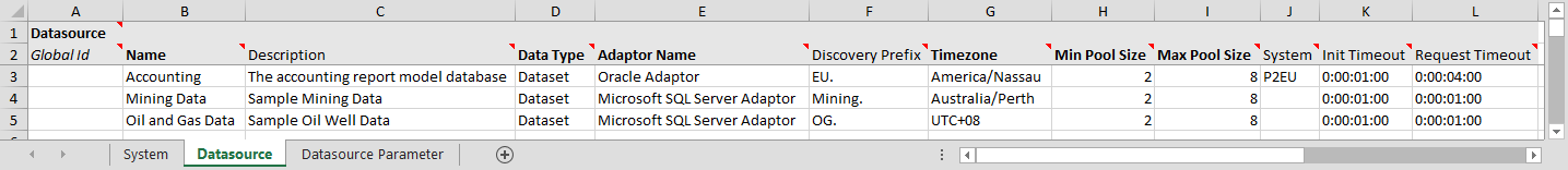 If you want to create or update dataset datasources as part of a bulk configuration, you need to use the following tabs in the Import/Export spreadsheet:
