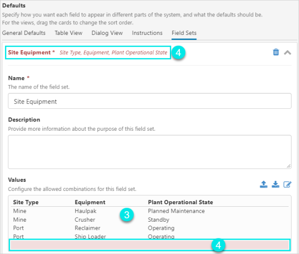 | 1. Fields | The fields in the field set. Only single select named list fields can be used in field sets. |