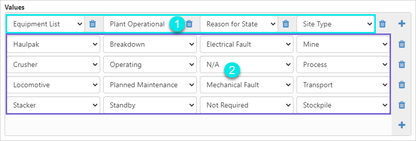 | 2. Values | The field values that can be selected in the entry dialog. |