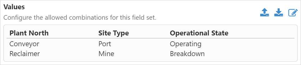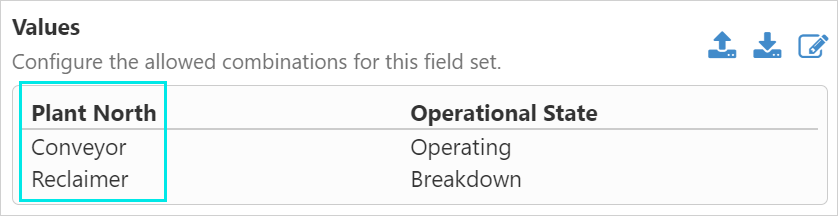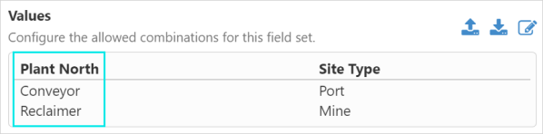 Field sets Operational State and Site Type are linked through the common field Plant North, and together, behave the same as the field set Plant.