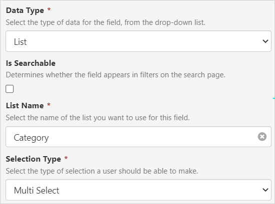 This field type allows the user to choose items from a pre-defined Named List. You can also specify whether only a single item should be selected, or if multiple items can be selected.