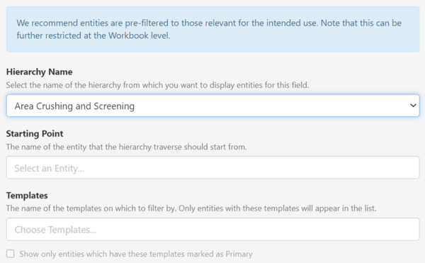 In the dialog, users will be able to enter the name, or part of the name, to search for an entity. The entities that are available for selection can be restricted to a certain hierarchy, part of a hierarchy, or a template. The selection restrictions can be applied either in the Field or Workbook configuration.