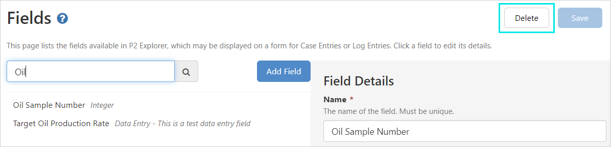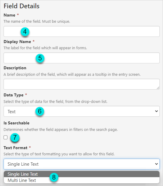 4. In the Field Details section, enter a unique Name that does not contain any reserved characters.