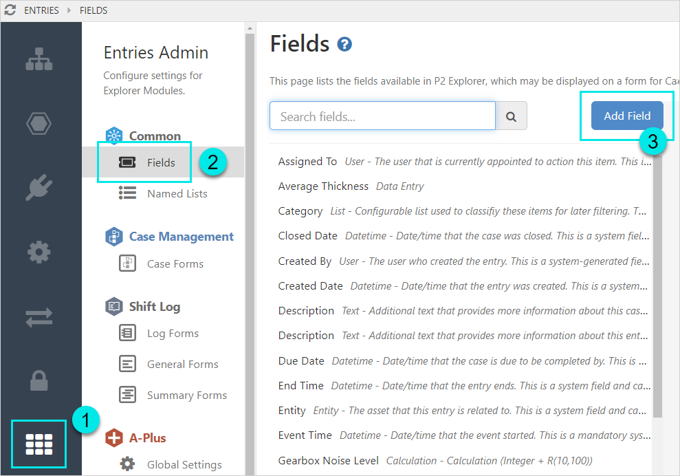Fields are the properties that appear in an entry, and this means they are in the entries table and in the entry dialog. Fields must be assigned to a Form and the same field (such as Category) can be assigned to many Forms. Fields are created independently of a Form.