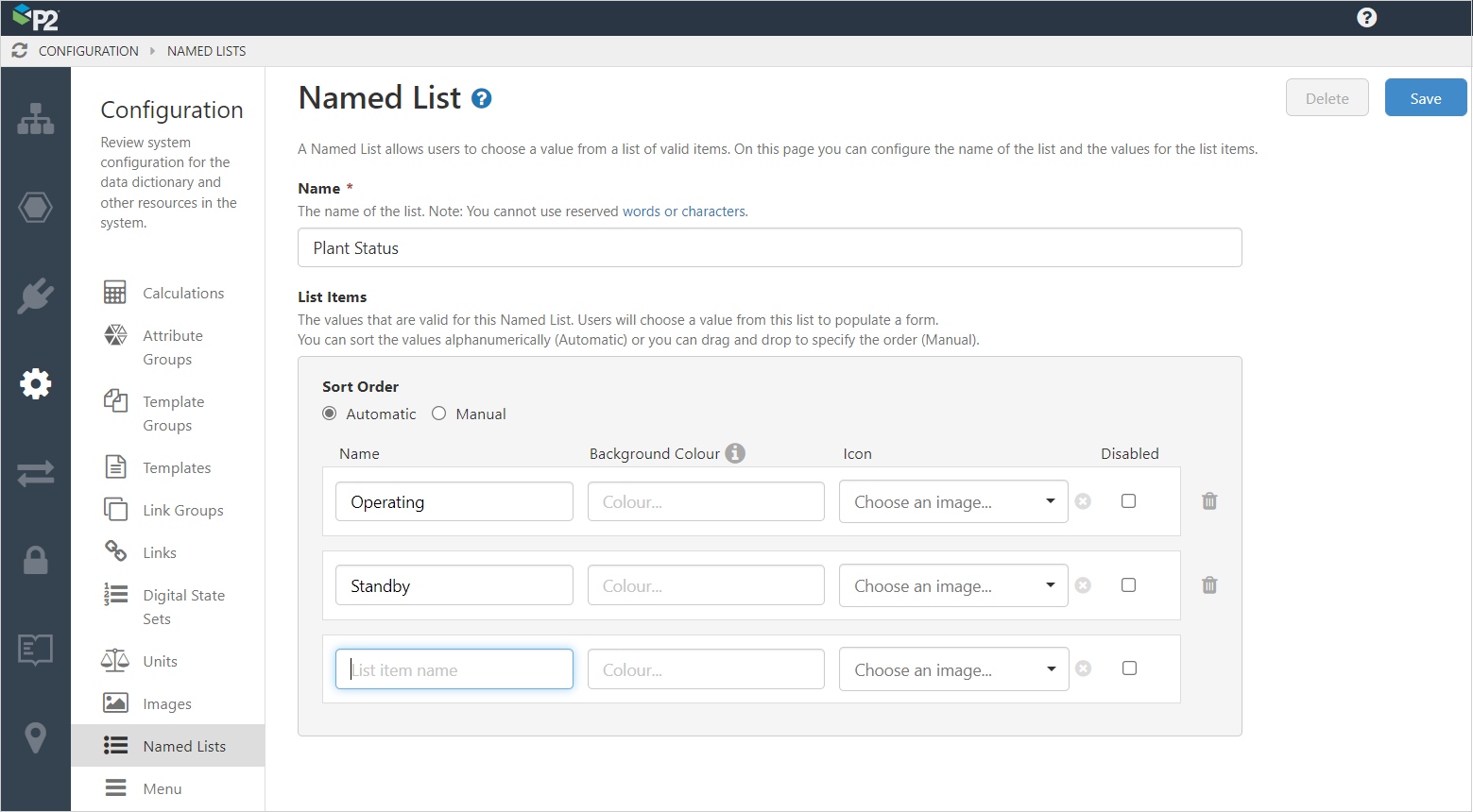 A Named List enables items to be presented in a list, wherever a Field of type List is used. This allows users to choose from a list of valid items when they are completing an entry form.