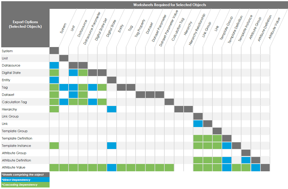 When you import data using the spreadsheet, it’s not always necessary to complete all worksheets if you only need to update certain objects. If that’s the case, you only need to complete those worksheets related to the objects you want to import. These are indicated by the grey cells in the diagram below.