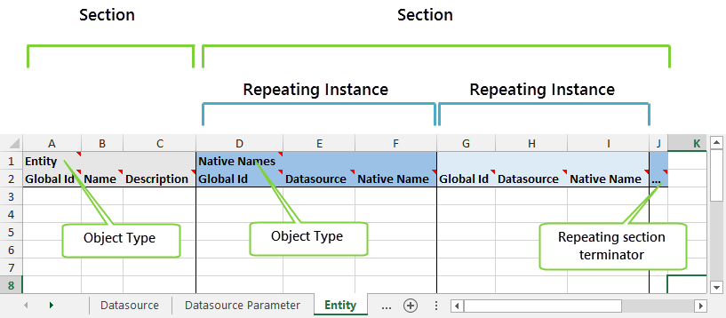 Some worksheets have multiple sections. A section refers to a grouping of columns with respect to an Object Type. The second section, if it exists, may contain one or more repeating instances.