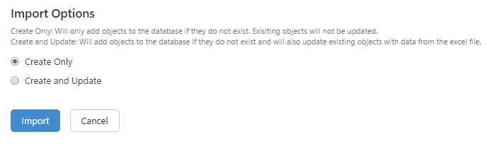 - Create and Update. Existing objects will be UPDATED with data from the import file, and new objects will be ADDED if they do not exist.