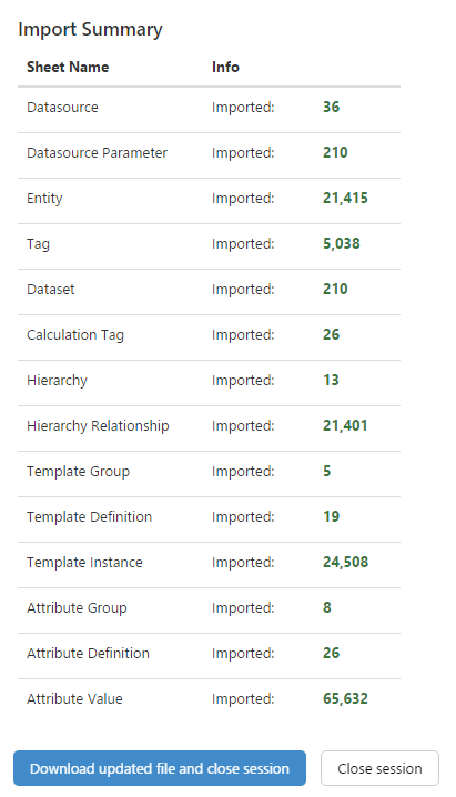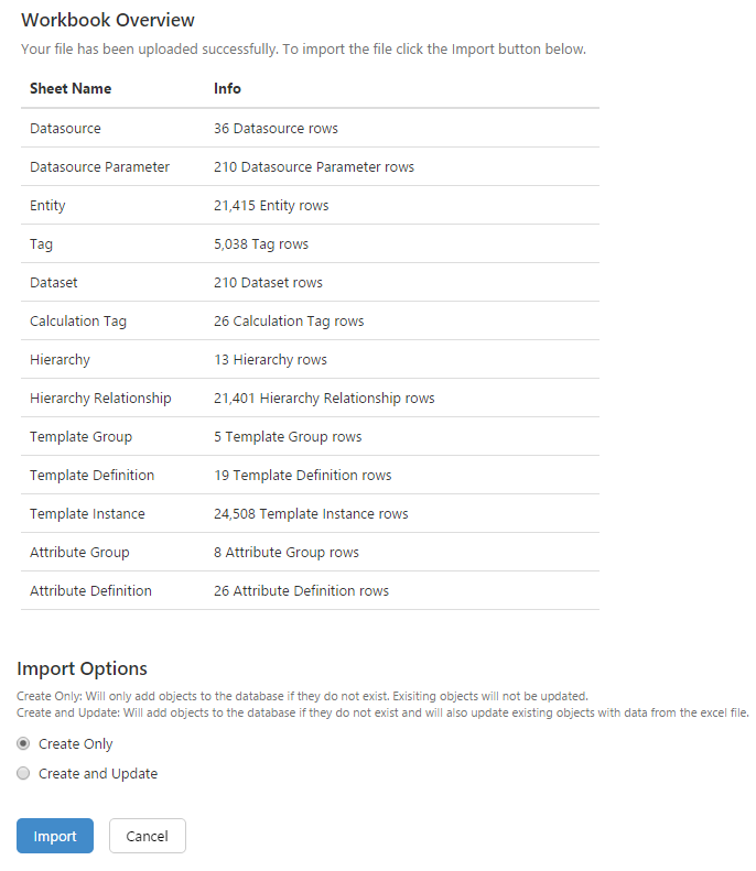 The process continues as soon as IFS OI Server detects your file. First, the file is checked for errors and an overview of the upload is displayed. The overview tells you how many rows have been counted for each worksheet, and highlights any errors that may be encountered. The overview for an error-free spreadsheet looks something like this: