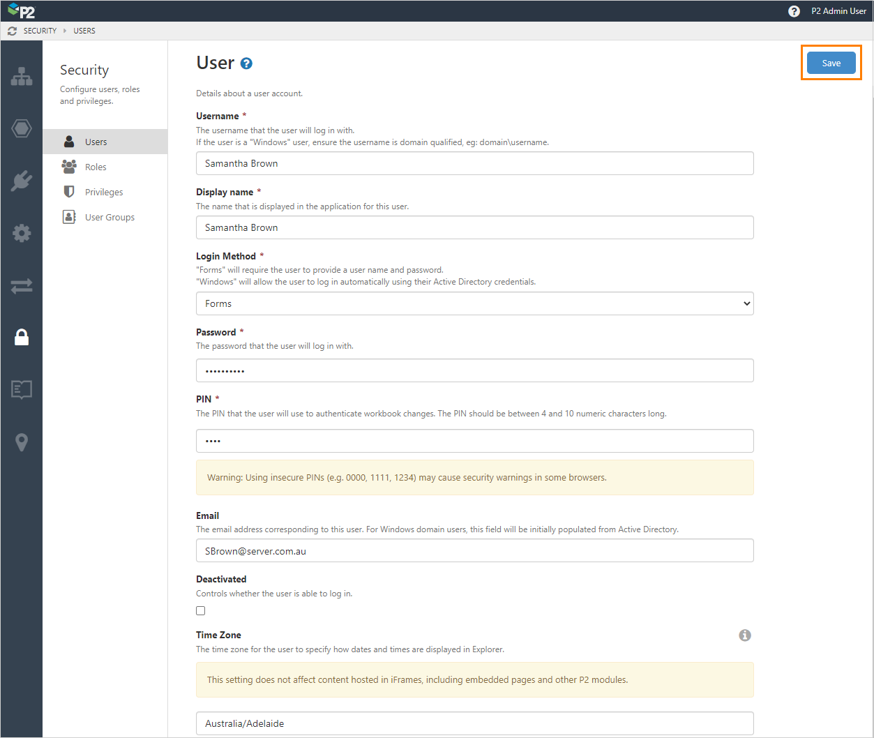 - Deactivated: Selecting this check box will prevent the user from being able to log in. You may wish to do this if you want to create a user account, but do not want them to access the system until a later date. You will need to come back in and clear this check box when you want them to have access.