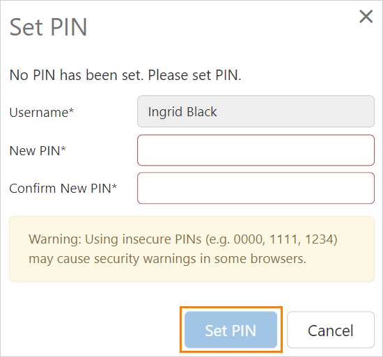 If no PIN has been set, enter a value of between 4 and 10 numeric characters twice, and select Set PIN.