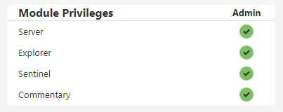 - Module Privileges grants admin privileges over all resources and objects in the selected module. When selecting this, the privileges for resources belonging to this module will all turn blue, to indicate that the privilege is inherited from the module-level privilege.