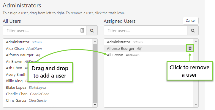 - To add a new user, drag and drop someone from the All Users list (on the left) to the Assigned Users list (on the right).
