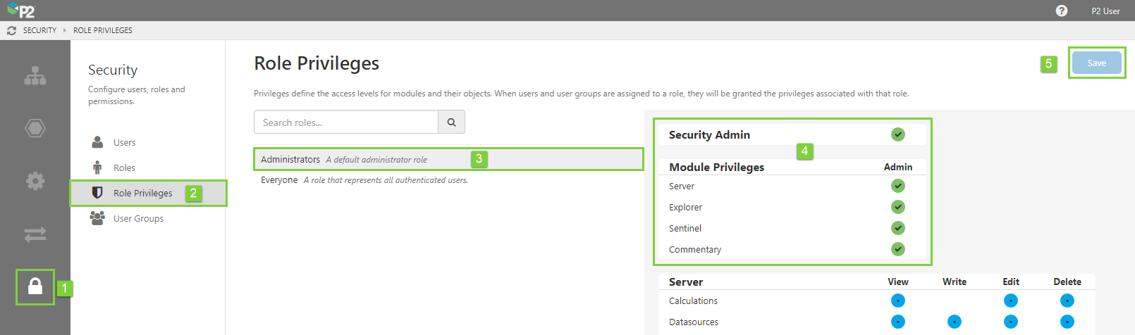 - Module admin: An admin user for a specified module will have all the privileges for all resources within that module. This type of admin user is also able to change the assigned privileges for objects associated with resources in that module, however they cannot access the Security