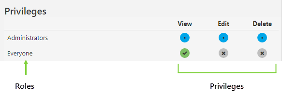 Note that privileges cascade here too, with the highest level privilege generally on the right, and the lowest on the left. When you assign a high level privilege, such as Delete, lower level privileges are also automatically granted when that privilege is required to perform the action. This is shown by a green circle with a dot.