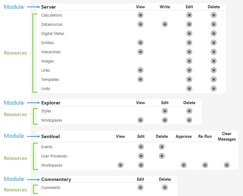 The type of privilege that can be applied to a resource depends on the module - e.g. most resources have View privileges, but only the Sentinel module provides the Re-Run privilege on its workspaces resource.