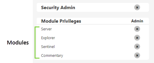 Module level privileges provide administrative access to all resources and objects for a particular module. A module is the part of the software that allows P2 Explorer to provide various capabilities. For example:
