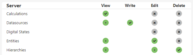 Green tick: Privilege is explicitly granted, associated privileges will also be automatically granted.