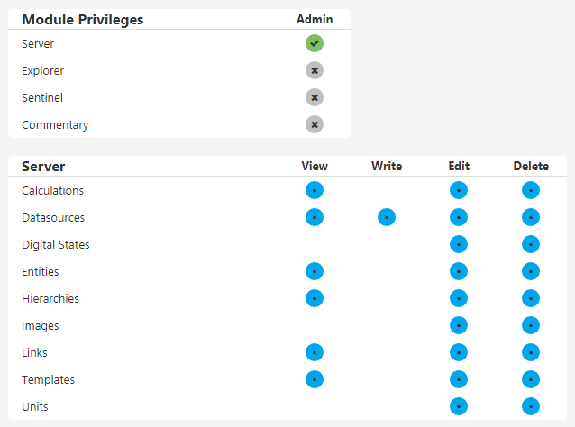 Blue: Privilege is granted because it is inherited by a module privilege.