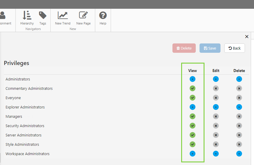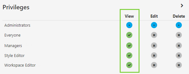 Take note of the View privileges, and especially the blue ones. These are the roles that have the privilege applied at the resource or module level. If you do not want any of these roles to see this workspace, go back into Role Privileges and remove it from the role (see Step 1 above).