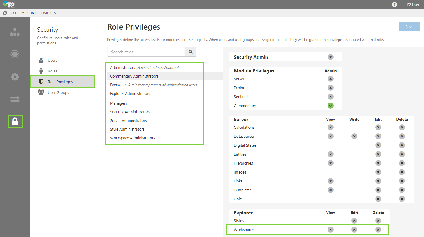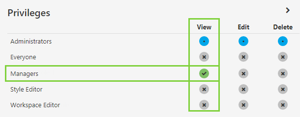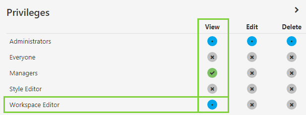 Next, you will notice that the remaining roles all have explicit (green) view privileges for the workspace. This is because of default security, whereby all users have view access to all objects. We can override this default security here.