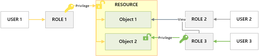 In the scenario above, Role 1 has been granted an explicit privilege for the resource. Roles 2 and 3, while not given resource privileges, still have default privileges for Object 1.