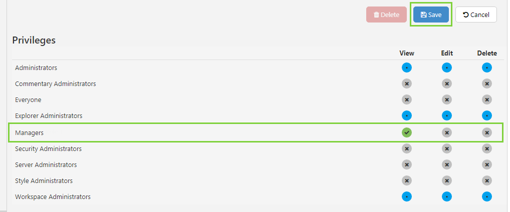 For each role, except the Managers role, go through and untick the green View privilege. The only role want to be able to view this workspace is the Managers role, so that will remain green.