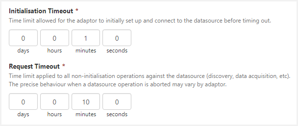 Two new configuration parameters have been added to both tag and dataset datasources, which provide timeout options for the datasource. There are separate timeouts for adaptor initialisation and data fetch calls.