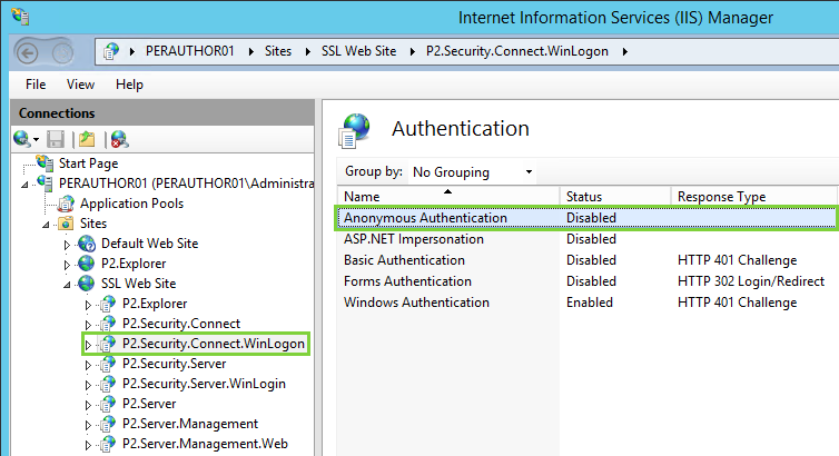 Cause: This is due to Anonymous Authentication being enabled on the P2 Security website. The site requires that Anonymous Authentication be disabled.