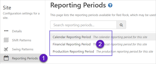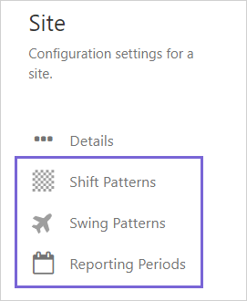 Sites, with defined shift and swing patterns, and reporting periods, are used in A-Plus and Shift Log.