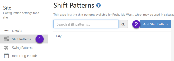 | Shift Patterns | Displays the list of available shift patterns, and the option to add a new shift pattern. |