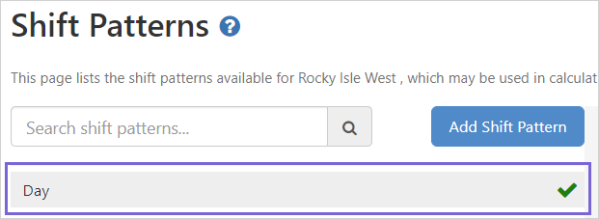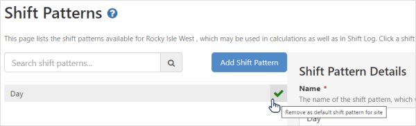 A green check mark on the right side of a shift pattern, indicates that the shift pattern is the default pattern for the site.
