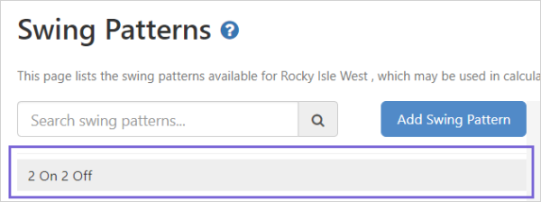 A swing pattern details the number of work days, the number of days off, and the starting date of the swing. Each work group will follow a particular swing pattern, and each swing pattern can be assigned to multiple work groups.