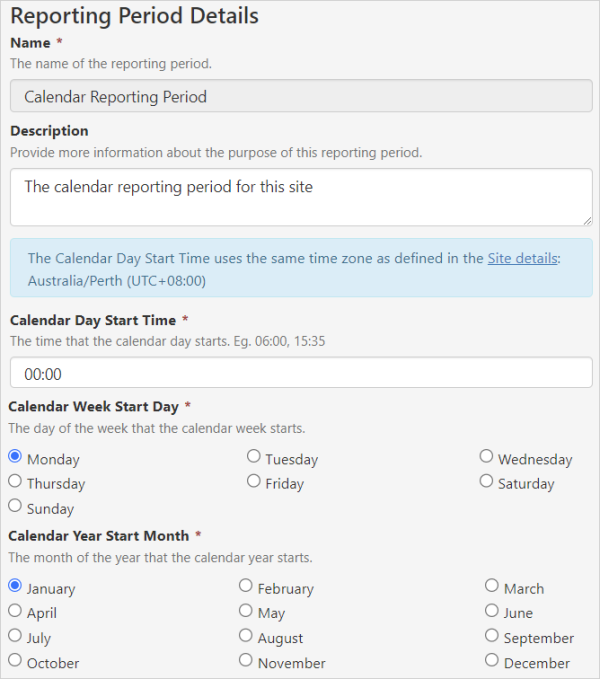 The reporting periods are a selection of time periods that can be set to reflect the starting time, weekday and month for a: