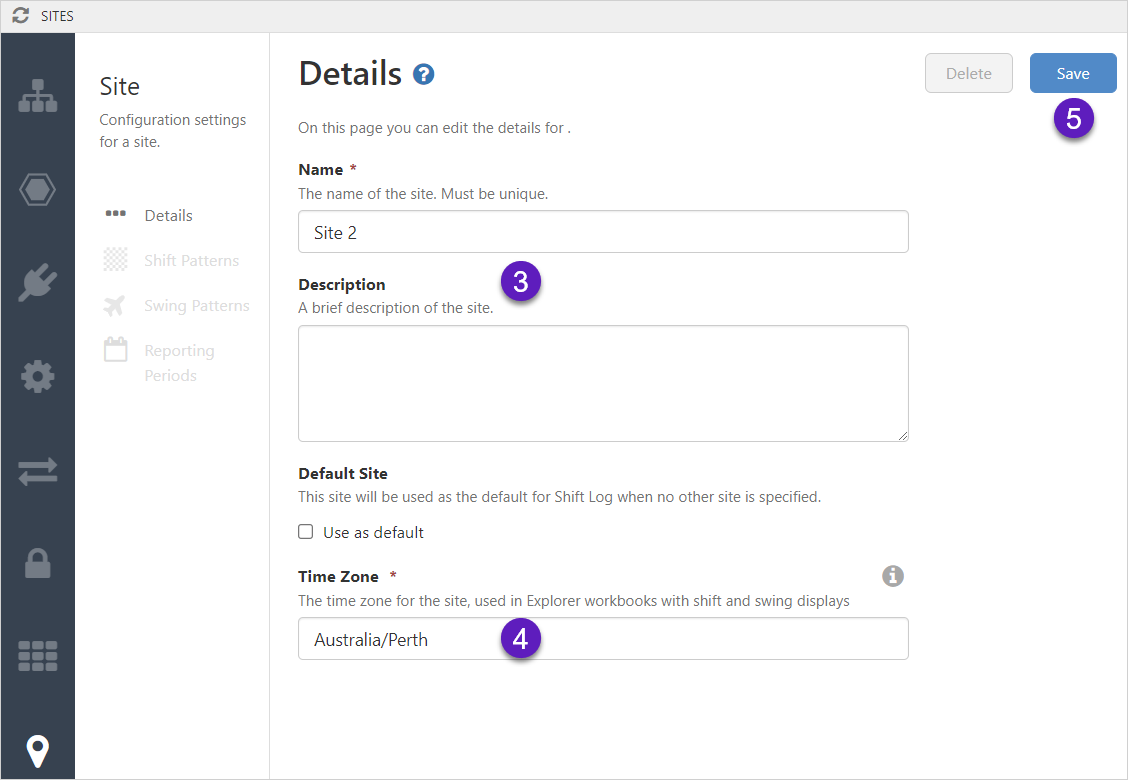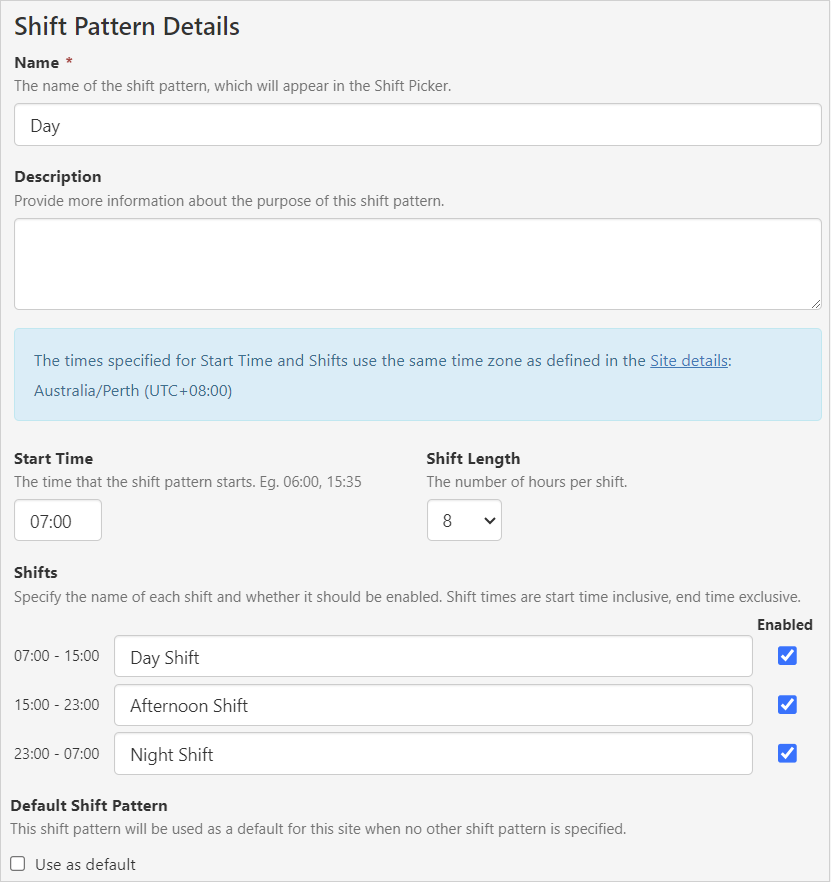 | Default Shift Pattern | A shift pattern can be specified as the default pattern for that site, and it will appear as the default shift in Workbooks. This is used by shift-based calculations. |