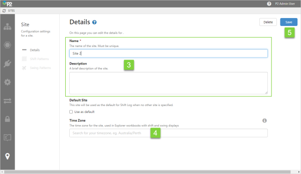 Sites, and shift and swing patterns, are configured in P2 Server Management.