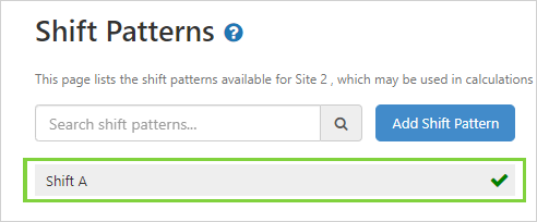 A green check mark on the right side of a shift pattern, indicates that the shift pattern is the default pattern for the site.