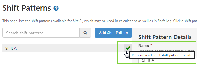 A green check mark on the right side of a shift pattern, indicates that the shift pattern is the default pattern for the site.