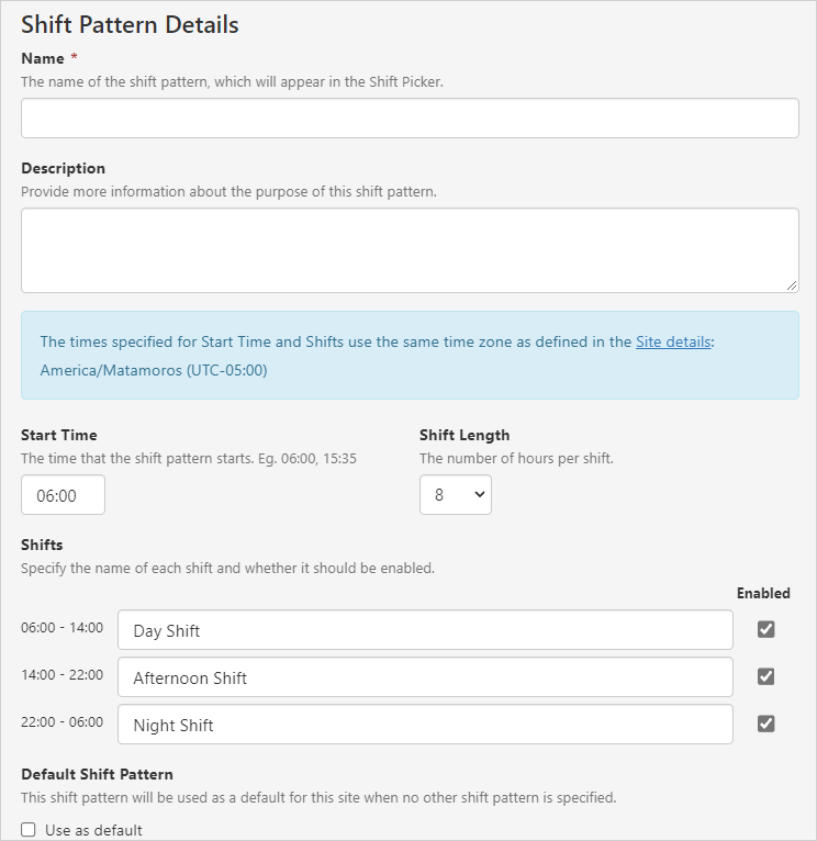| Start Time | The starting time of the first shift E.g. 06:00 |