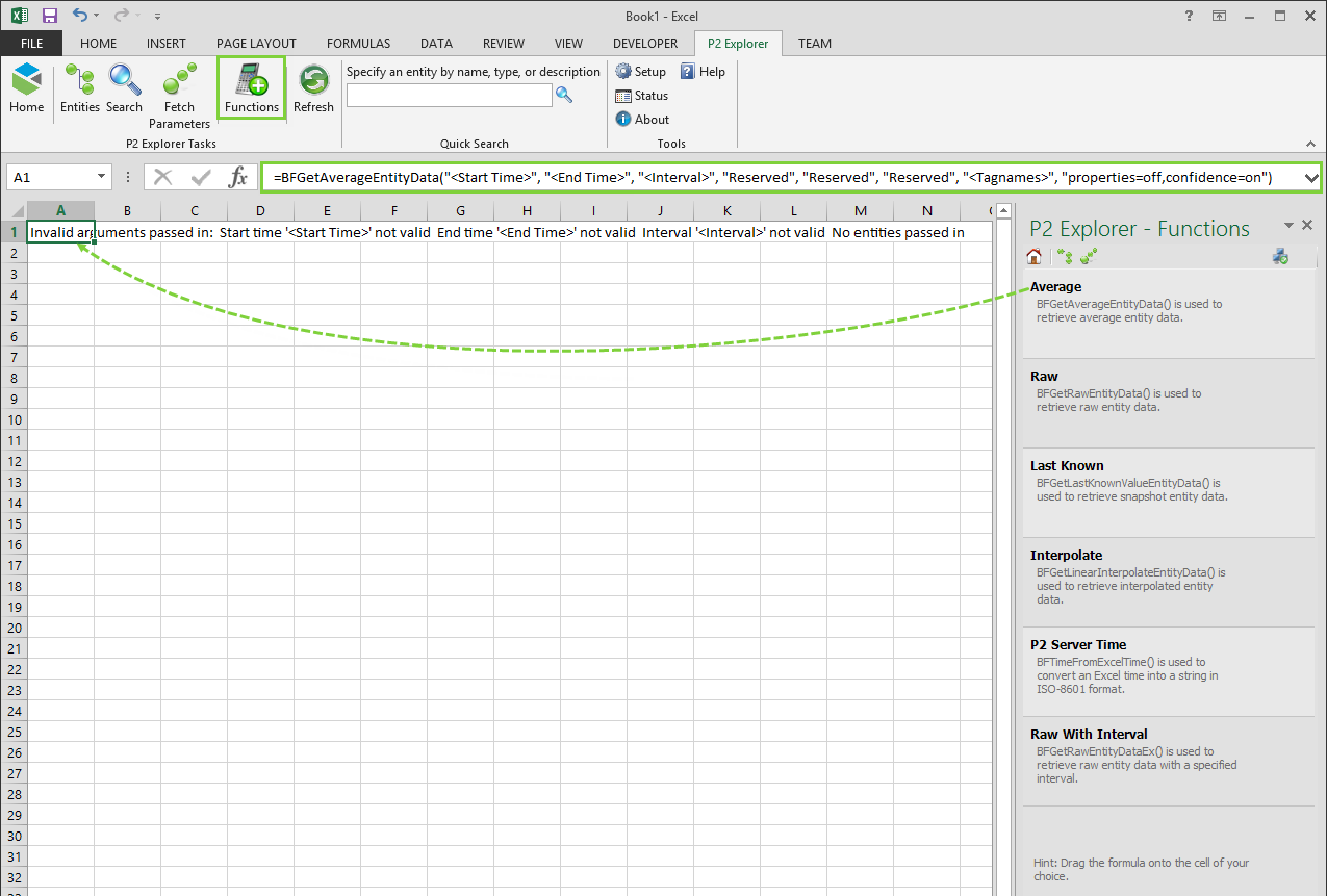 Entities: A string containing a semicolon-separated list of entity names. For example, "OICI001.PV;OICI002.PV;OICI003.PV". Alternatively, you can specify the entity names using the cell references. For example, if one entity name is in cell A2 and another is in cell A3, then the formula can be entered with 'A2 & ";" & A3' as the entity list (in Excel, an ampersand (&) performs string concatenation).