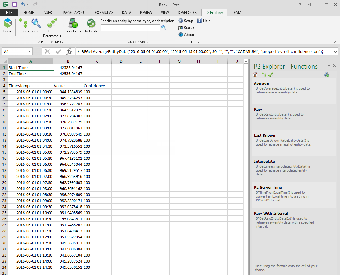 The above function describes a call to the BFGetAverageEntityData function of the IFS OI Excel Add-in. This function fetches the average sample type results for the entity "CADMIUM" from 1am on 1st June 2016 to 1am on 15th June 2016, and with an interval of 30 seconds.