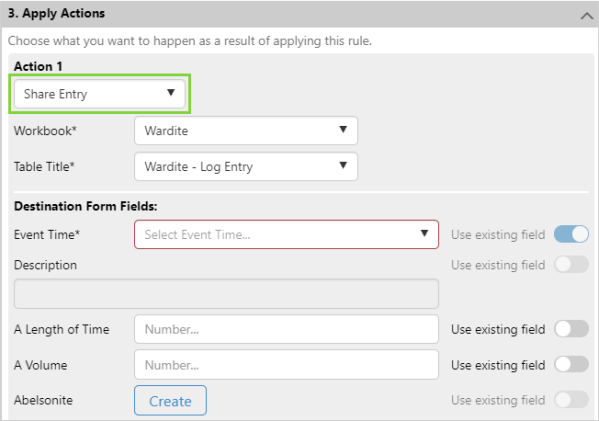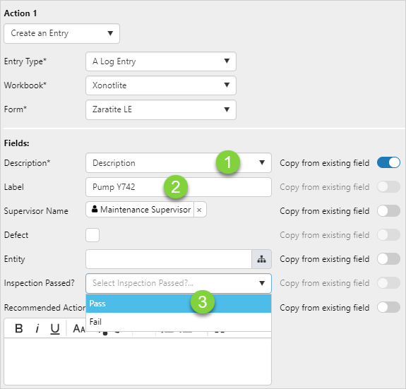 An action can be configured to create a new entry in the form specified in the action. Fields in the entry can be filled by: