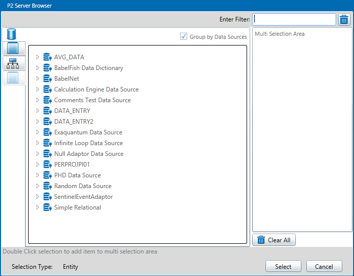 Data Sources: When you select the Data Sources tab, the drop-down list displays all the data sources configured in the Data Dictionary. You can select a data source from the list and browse its entities or use the filter to limit the displayed entities.