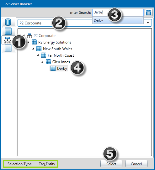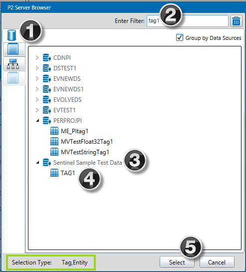 The Server Browser allows you to browse the Data Dictionary for entities, tags and hierarchies, helping you to find them by data source, template, or hierarchy. You can also filter the entities to show only those that match specified criteria.