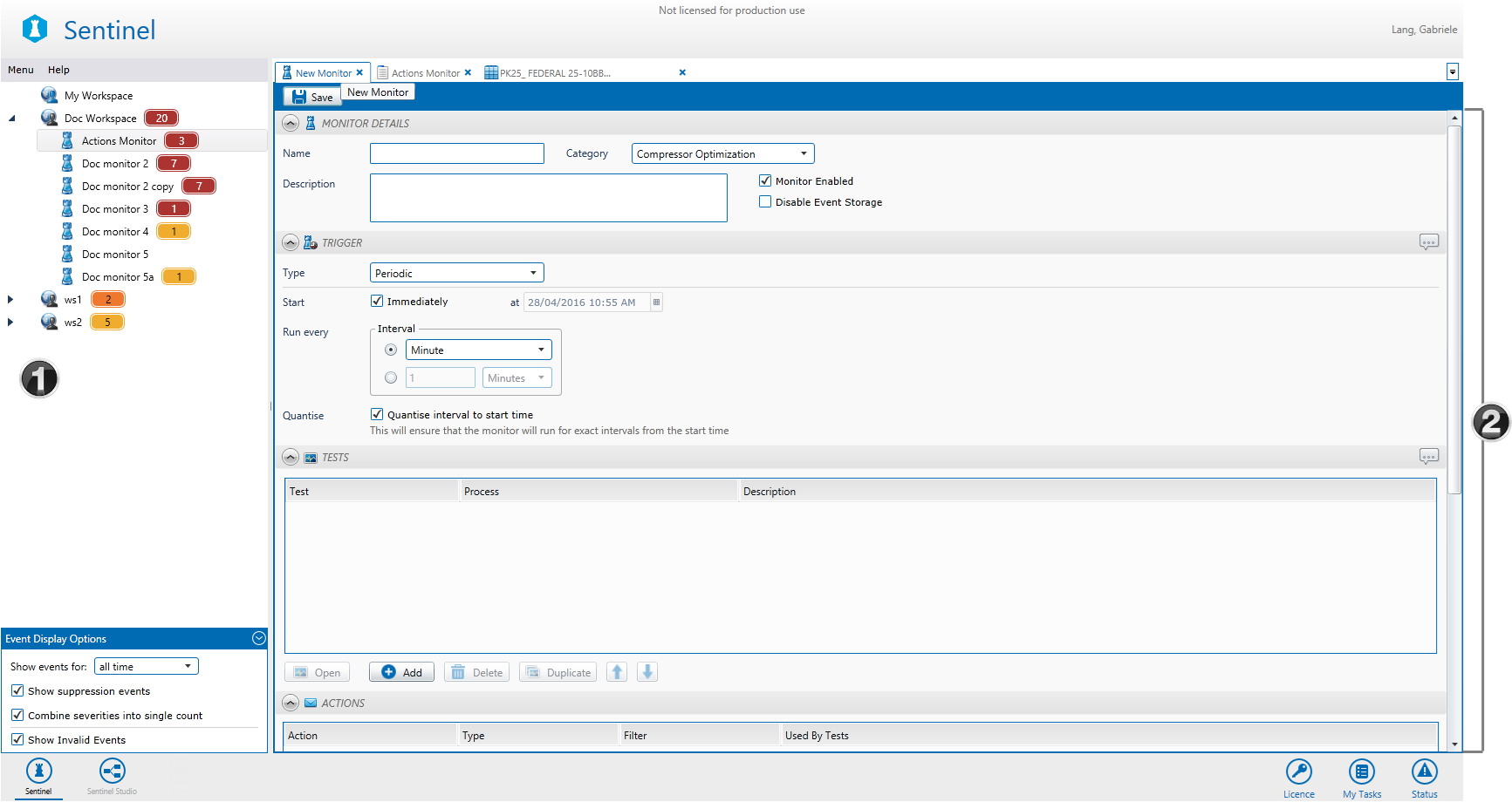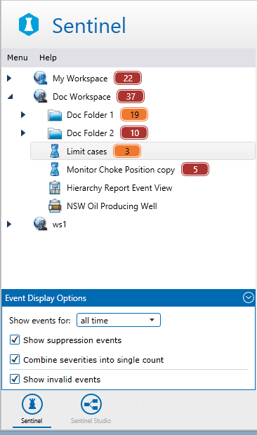 The Workspace panel is on the left side of the Sentinel screen and contains a hierarchical list of all the Sentinel workspaces, folders, monitors, and event views.