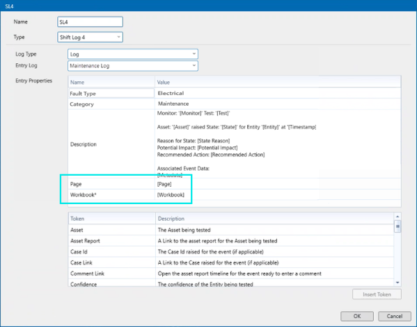 Page and Workbook tokens in Shift Log 4 action: